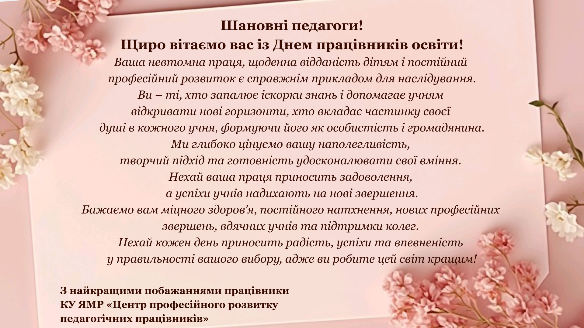 Бажаємо вам міцного здоров’я, постійного натхнення, нових професійних звершень, вдячних учнів та підтримки колег. Нехай кожен день приносить радість, успіхи та впевненість у правильності вашого вибору, адже ви робите цей світ кращим!