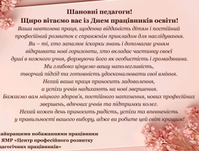 Шановні педагоги! Щиро вітаємо вас із Днем працівників освіти! Ваша невтомна праця, щоденна відданість дітям і постійний професійний розвиток є справжнім прикладом для наслідування. Ви – ті, хто запалює іскорки …